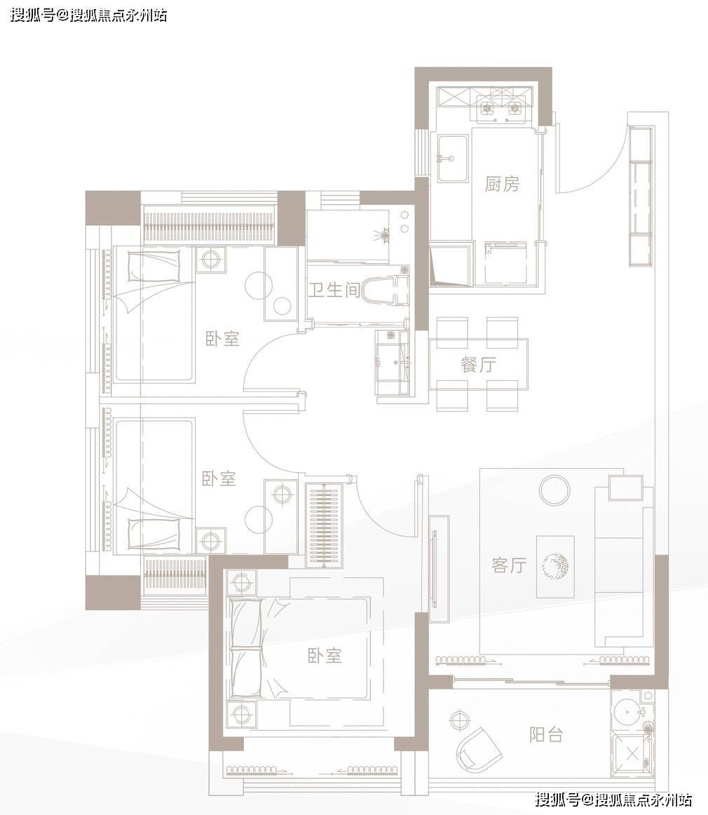 79㎡三房一卫户型:三面采光格局,让整个空间明亮通透。L型厨房设计合理,操作方便。双面采光卧室,为居住者带来明媚的起居环境。