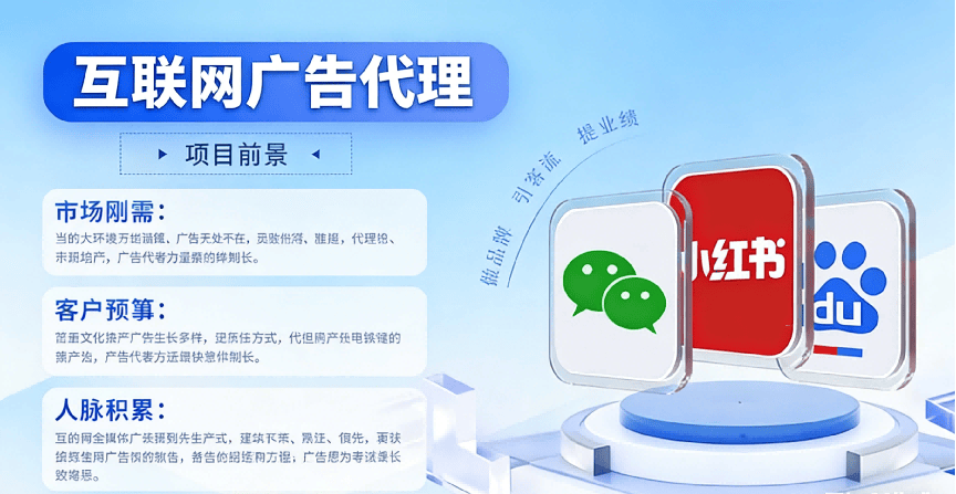 互联网广告投放项目,简单易上手,投入小变现快,0基础也可以做,主要是对接广告业务,总部包技术售后。