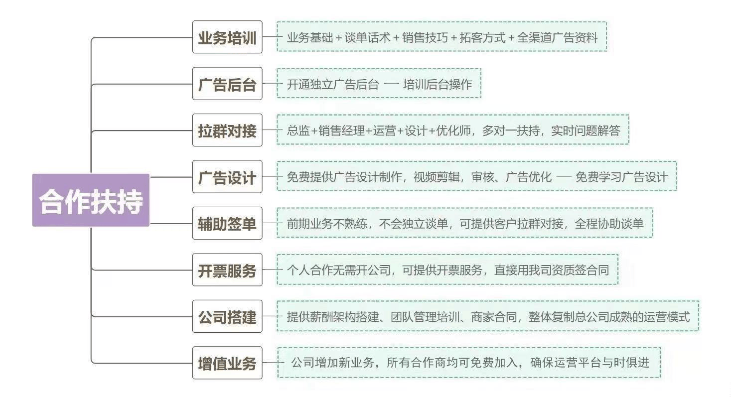 1、前期一对一落地对接培训,后期不定期组织业务赋能,培训资料包、营销方案、各行业投放案例,广告成交案例,谈单案例等全套支持。