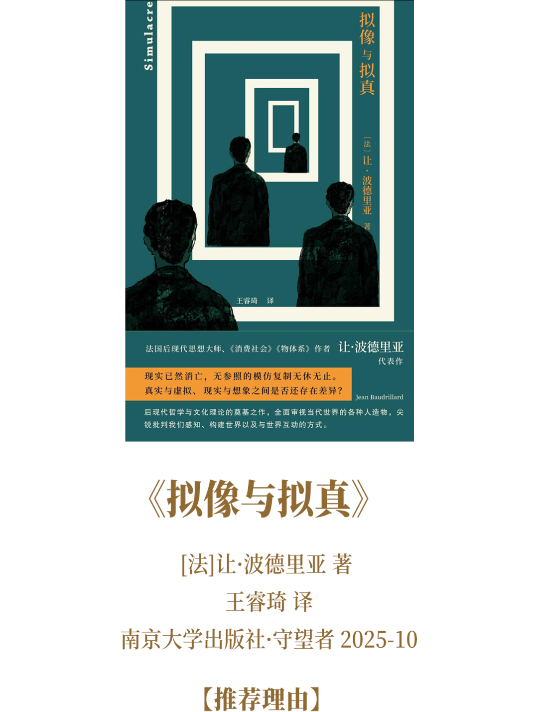 你还能想象没有电影电视、网络广告、超市与游乐园的世界吗?当现代生活被“拟像”所主导、数字化披着彩衣呼啸而至之时,《拟像与拟真》如利刃般划破虚饰,单刀直入地宣告了“现实”的终结。在这个“无参照的模仿复制”无休无止的超级现实世界中,拟像不再映射现实,而是先于并定义了现实。身处AI诱发意义内爆的当下,本书不仅是后现代思想的基石,更是我们在符号狂欢中刺破幻象、反思真相的清醒剂。