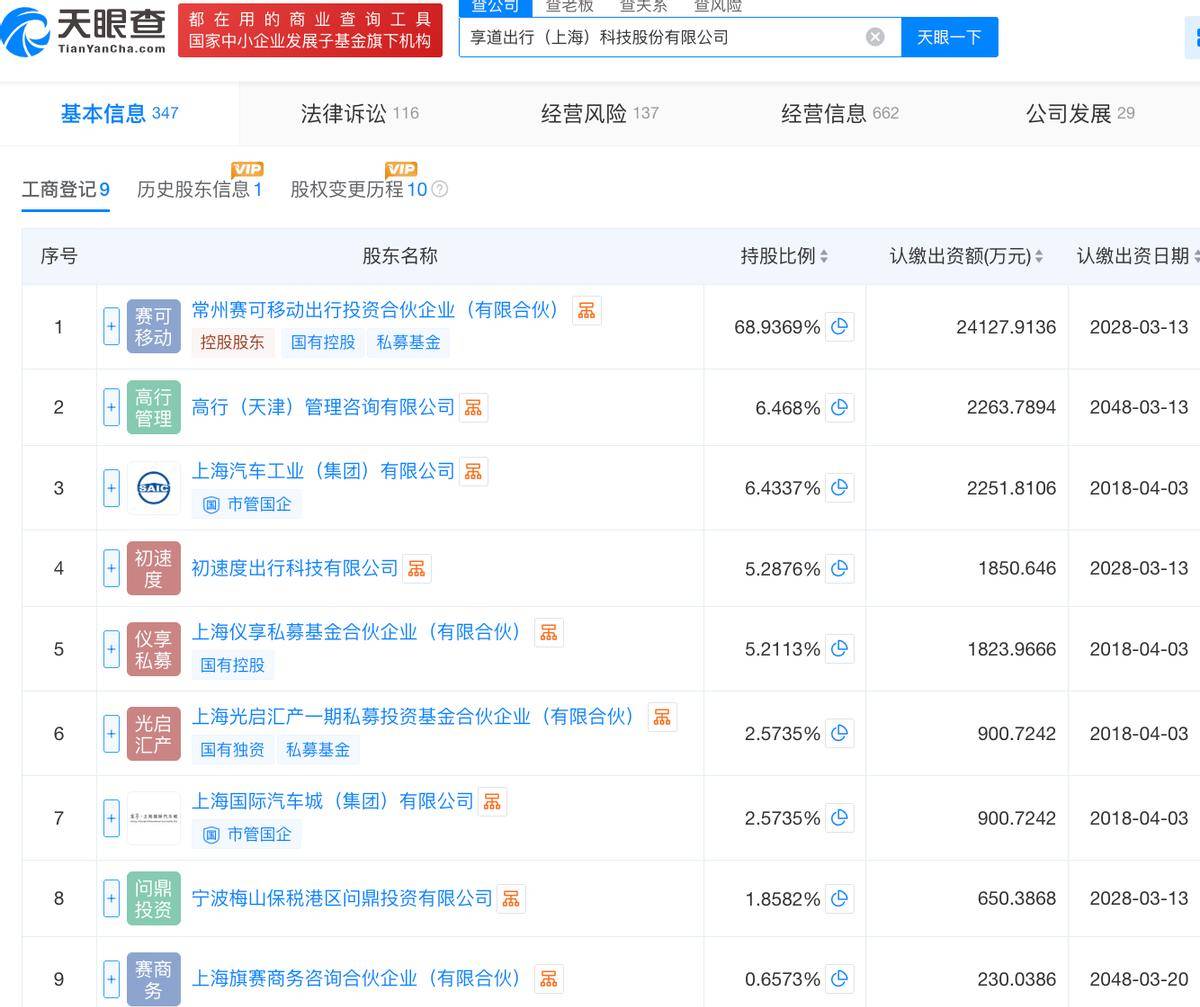 天眼查App信息显示,享道出行成立于2018年4月,前称为上海赛可出行科技服务有限公司,2025年9月改制为股份有限公司。目前,该公司的注册资本为3.5亿元,法定代表人为吴冰,主要股东包括上汽总公司、常州赛可等。