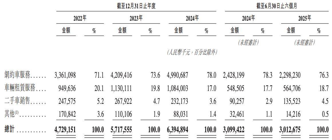 2022年、2023年、2024年度和2025年上半年(下同“报告期”),享道出行来自网约车业务的收入分别约为33.61亿元、42.09亿元、49.99亿元和22.98亿元,分别占其总收入的71.1%、73.6%、78.0%、78.3%和76.3%。