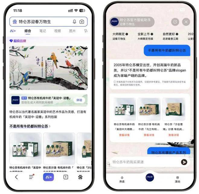 比如在特仑苏的案例中,当用户搜索特仑苏名画系列相关问题时,新搜索并未返回一个普通的新闻列表,而是呈现了一个融合了AIGC艺术大片、智能体对话、商品信息等丰富内容的完整体验空间。