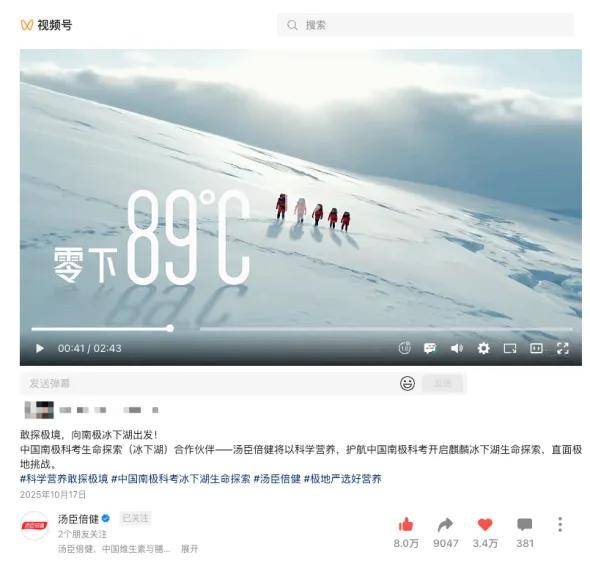 我们观察到近期的一个爆款案例,汤臣倍健结合第42次中国南极科考契机,推出了南极科考主题全AI品牌大片《敢探极境》,全程零实拍、纯AIGC制作。过去制作类似的视频,如果采用实景拍摄,一天费用动辄百万,且面临极端环境拍摄风险与生态保护压力。而全AI制作,不仅大幅降低了制作成本,还能突破南极冰下湖难以实拍等阻碍,还原南极科考震撼场景,实现理想的视觉效果,成功绑定南极科考IP,传递汤臣倍健的品牌精神。