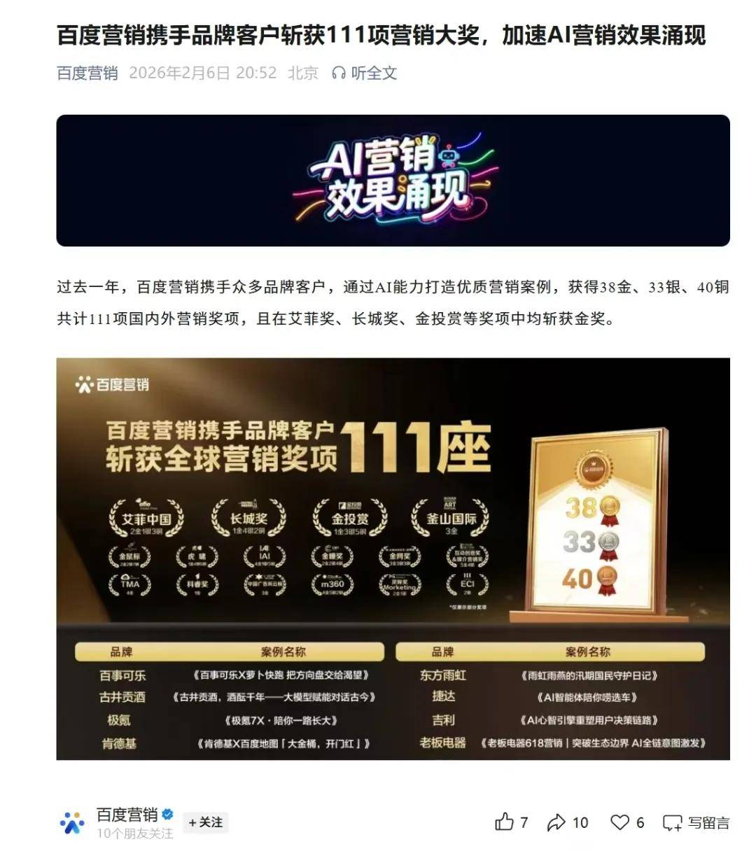 在这点上,百度AI营销的实践进展具有典型的参考价值。在2025年的营销奖项中,百度AI营销获得了111项奖项,并在艾菲奖、金投赏、长城奖等重点奖项实现了金奖全覆盖。奖项成绩证明,以百度AI营销为代表的营销平台,正在规模化帮助各行业客户应用AI技术转化为增长动力。